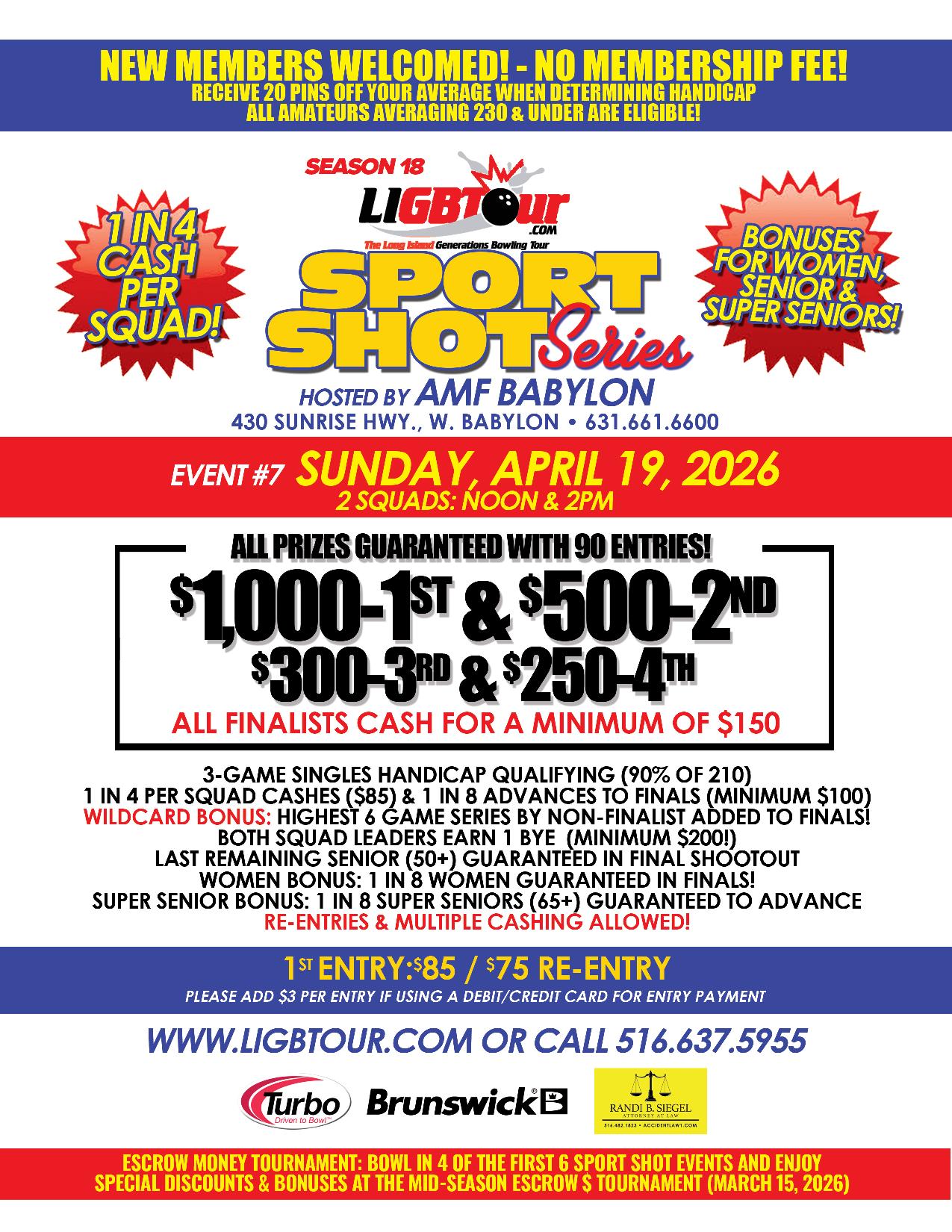 Congratulations to Jacob Nardello for winning the $1,500 top prize at Sunday's LIGBT's Sport Shot Bonus Tournament hosted by AMF Garden City. Jacob won his first LIGBT title by defeating Ted Panagacos 231-213. While Ted earned $1,000 for 2nd place, finishing in 3rd was Vito Genova Sr. with a 211 worth $700. Rounding out the top 5 was 4th place finisher Isaiah Zamor with a 210 earning $550, and 5th went to Dominic Vinas with a 200 taking home $500.