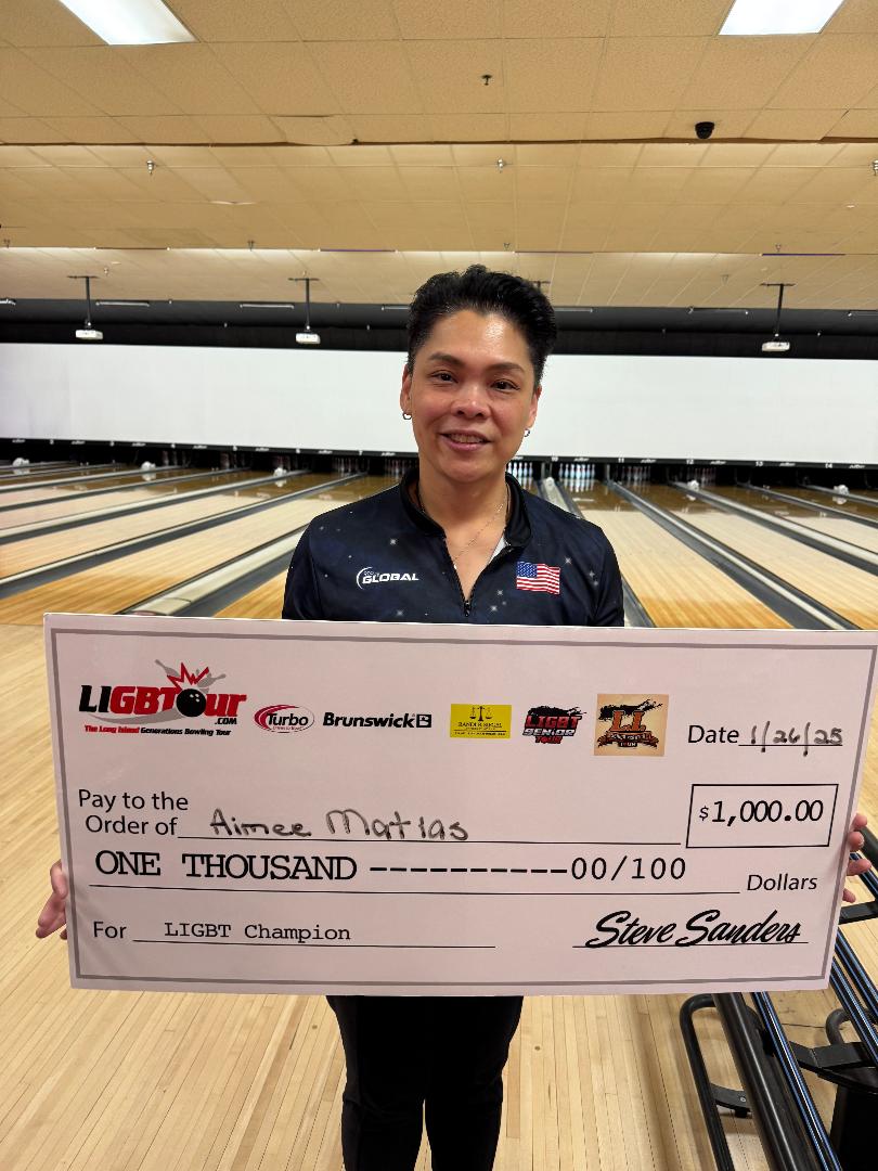 Congratulations to Aimee Matias for winning your first LIGBT title on Sunday at AMF Garden City. Amy earned the $1,000 top prize by defeating 4-time champion Darcy Monroe 232-227 in the final shootout. While Darcy earned $500 for 2nd, finishing in 3rd was the 2pm squad leader Nas Freeman with a 214 worth $300. Rounding out the top 4 was Curtis Hetmeyer with a 165 worth $250.