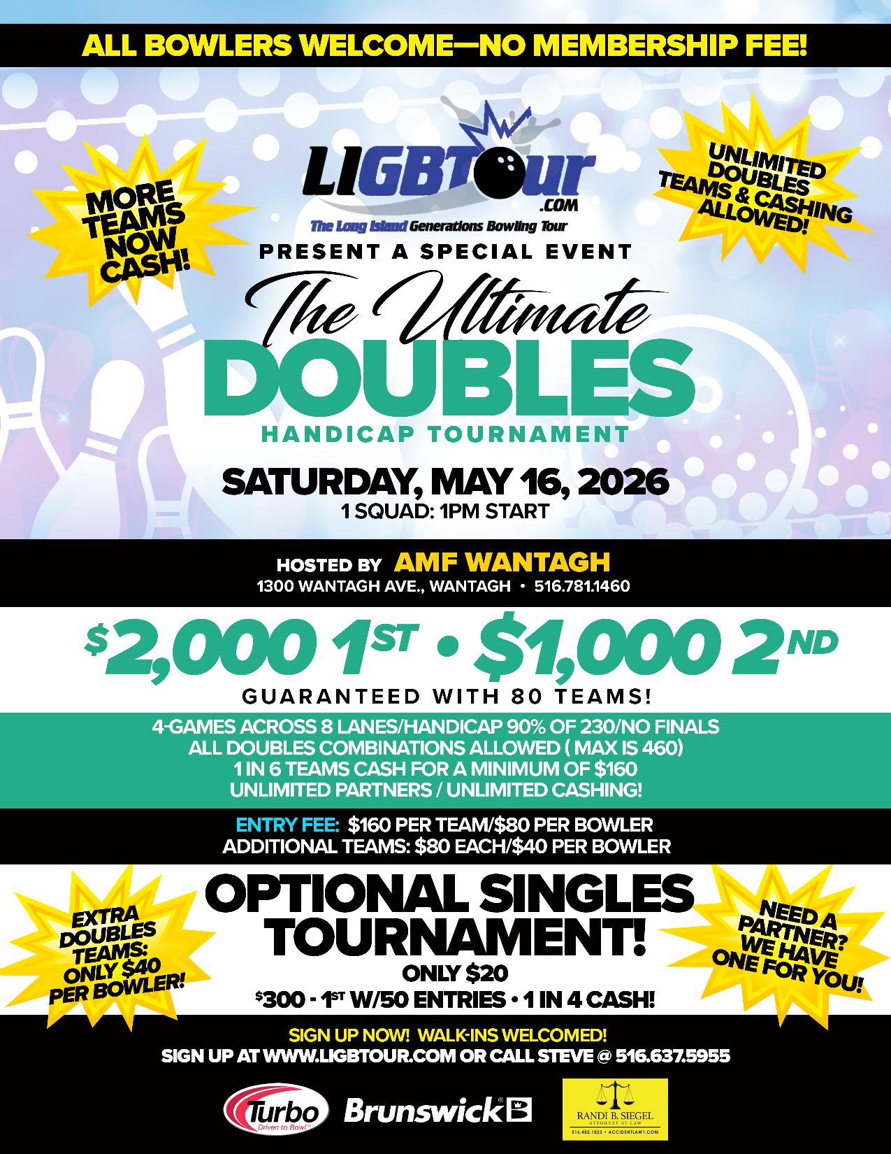 Thanks to everyone that participated at Sport Shot Series #6 and congratulations to all of the cashers. The LIGBT is running a handicap doubles tournament this coming Saturday, April 25th (noon start) at AMF E. Meadow. Have a great week!